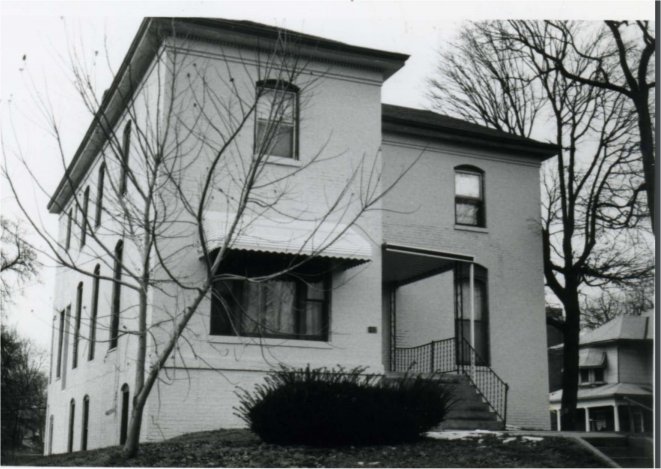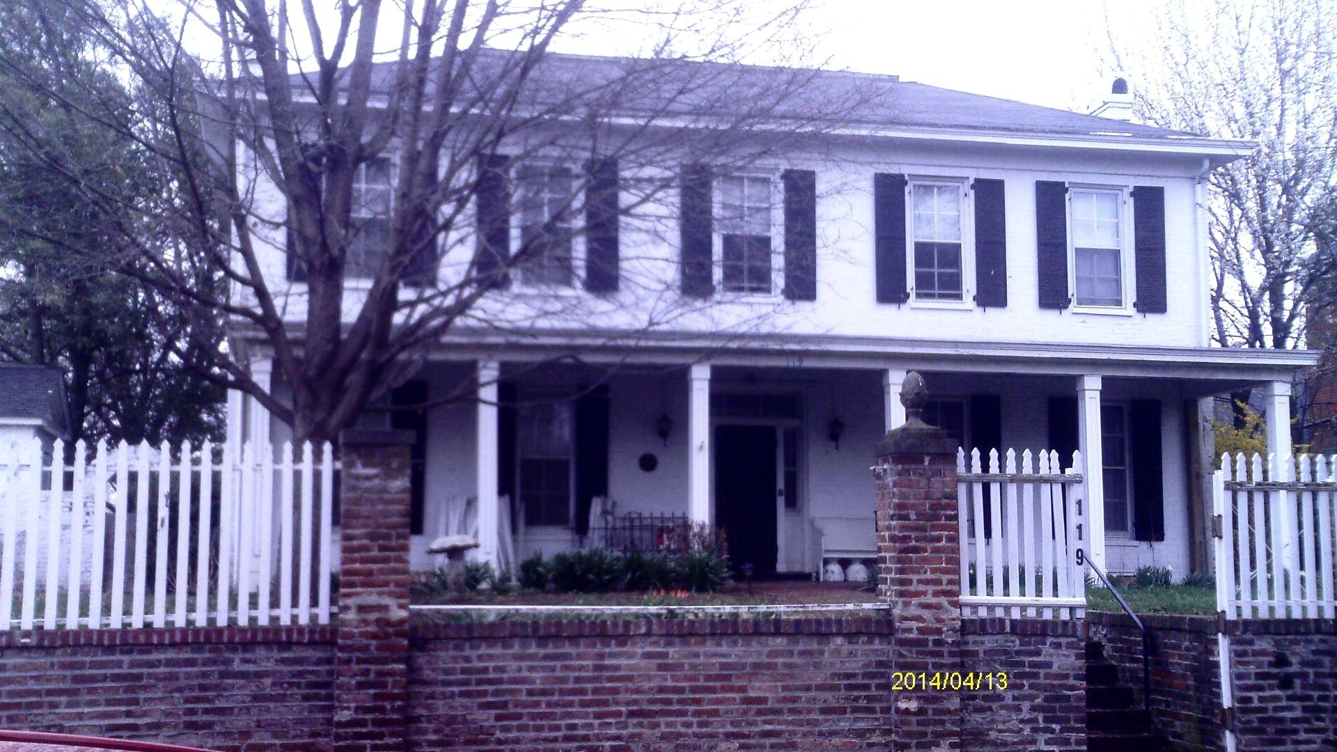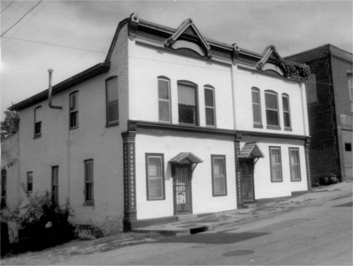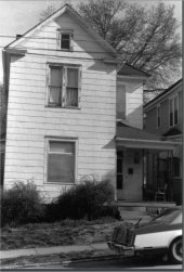 townhouse variant with Colonial Revival influence, built in 1908. Cross gable roof covered with asphalt shingles,