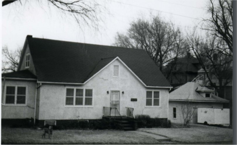 with box cornice and frieze, gable end covered with fish scale shingles and has two 1/1 double-hung sashes. Exterior